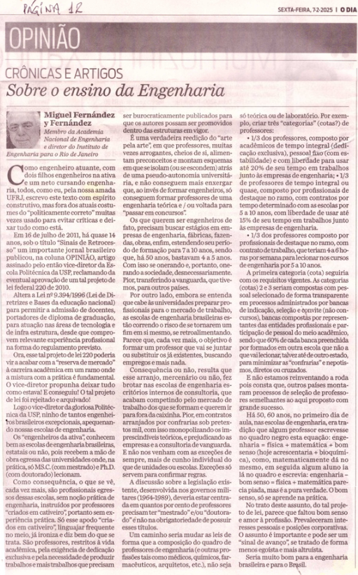 As a practicing engineer, with two sons who are active engineers and a grandson studying engineering, all, like me, at our beloved UFRJ, I write this text with a constructive spirit, but outside the current customs of “political correctness” often used to avoid criticism and leave everything as it is.